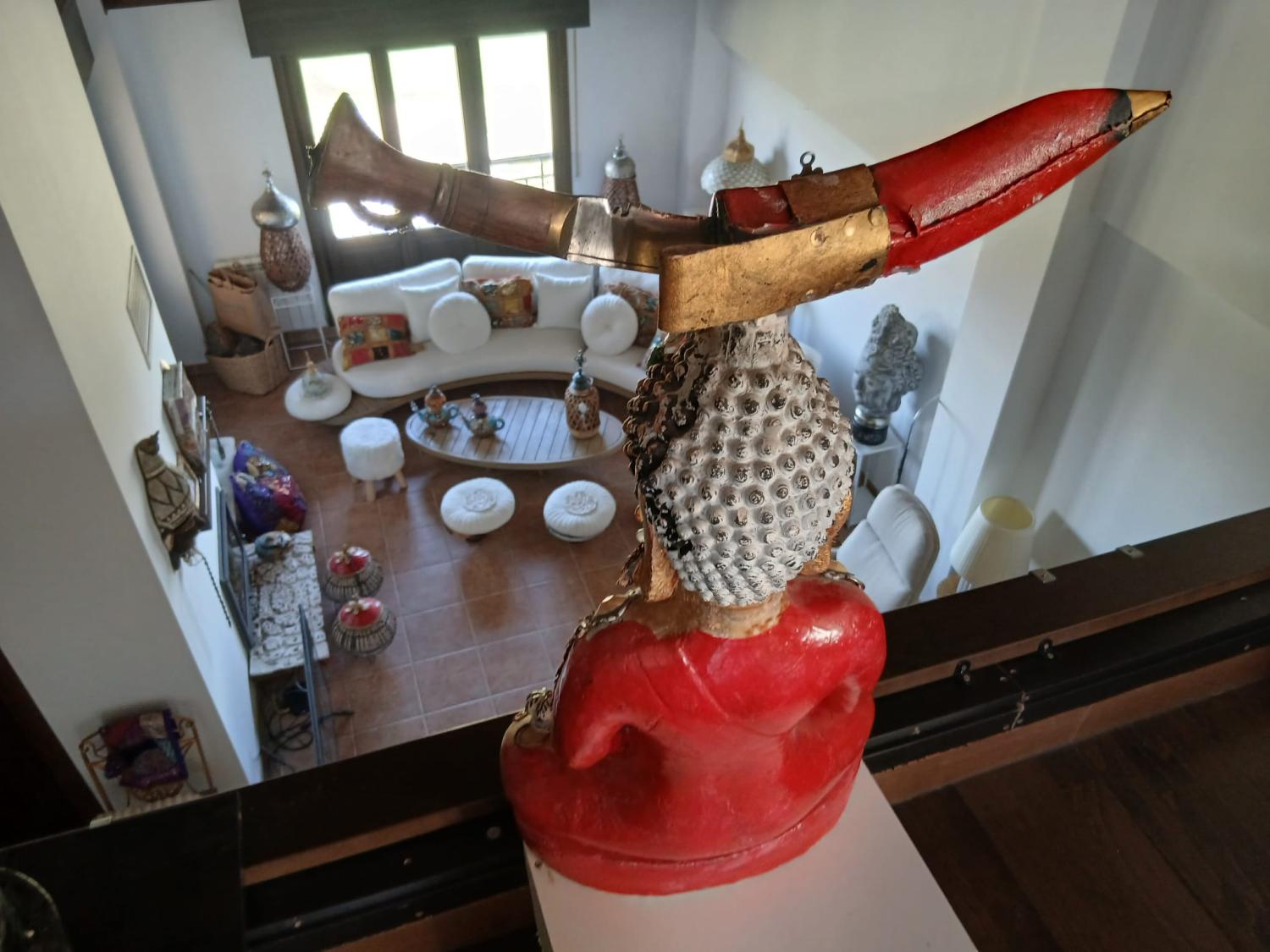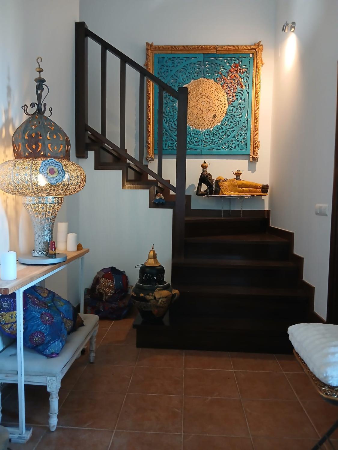 Bajamos por las escaleras y nos llama la atención la escalera y el techo de madera que lo hace más acogedor aún.